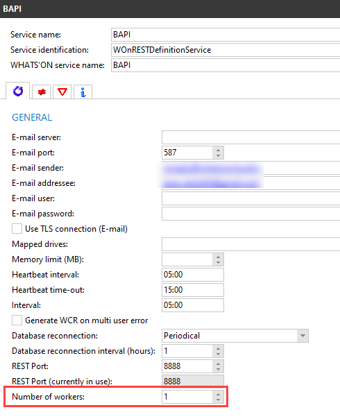 On REST services, such as the Business API interface service or configurable REST interface service, the Number of workers field has been added.