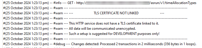 When a REST or SOAP service is started without a certificate, the service log will show a warning as well: