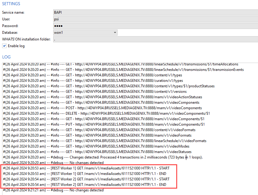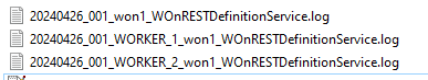 The main service log (for example, 20240426_001_won1_WOnRESTDefinitionService.log) will now contain less information. The details of the calls processed by the workers will be stored in separate worker logs. (For example, 20240426_001_WORKER_1_won1_WOnRESTDefinitionService.log)