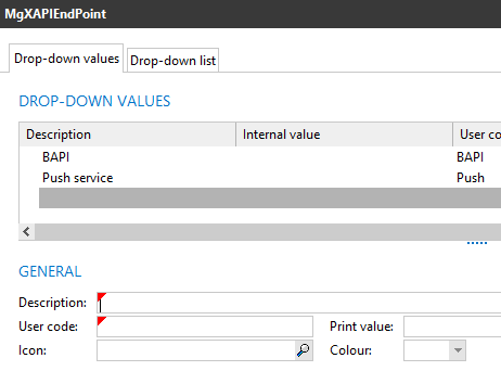 The field takes its values from the new drop-down list MgXAPIEndPoint. The user code for each value is mandatory since it will be used for authentication.