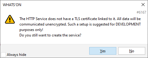 From this version, to avoid this happening by accident, message 6167 appears when no certificate is defined and the user saves after editing the service configuration: