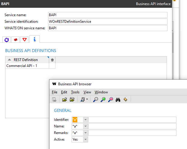 When adding business APIs to the business API interface service, the Active criterion on the browser is now set to Yes to filter out the BAPIs not part of the Available Business APIs field. The inactive APIs are indicated in the result list with a trash can icon.