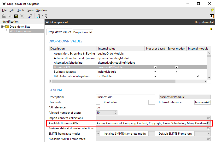 From this version, the Available Business APIs field has been added to the WOnComponent drop-down list.