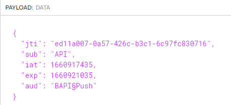 When a user authenticates to a REST API service by sending a login call, the token is returned. When it is decoded, the aud claim will contain the user codes of the API endpoints of the user. In my example, the user has the endpoints BAPI and Push defined.