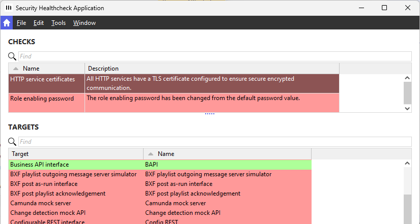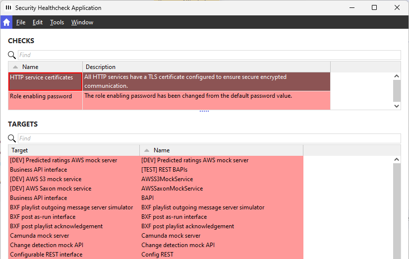 If not, the item in the CHECKS list will have a red background. When it is selected, the TARGETS list contains the services that are checked. The list shows the service identification in the Target column and the service name in the Name column.