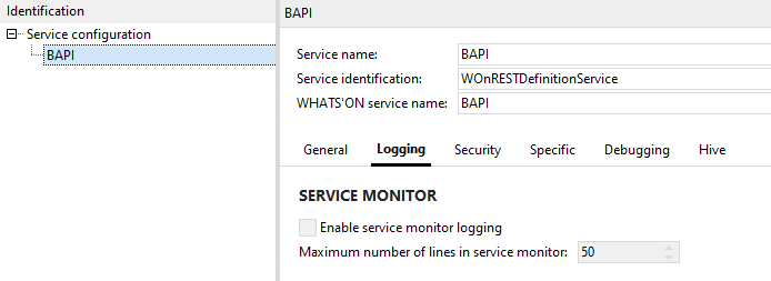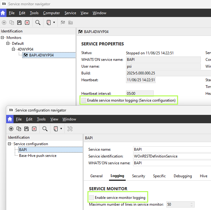 The Enable service monitor logging (Service configuration) property can also be configured for each service in the service monitor navigator. It is affected by the Switch off all service monitor logging check box in the same way as those on the services, since they are connected.