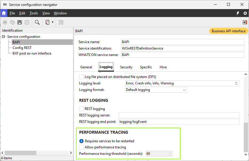 Allow performance tracing: Select to enable performance tracing for the service. When this is done, the Performance tracing threshold is enabled.