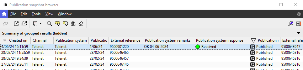 The call returns all publication snapshots matching the filter parameter and their attributes. Note that, even if no parameters are included, only the most recent publication snapshot of publication records with the status Published are returned. For example, if the record was published three times, only the last one is returned. This also means snapshots of publication records with a status other than that, for example, New, New input after approval, Deleted, are ignored.