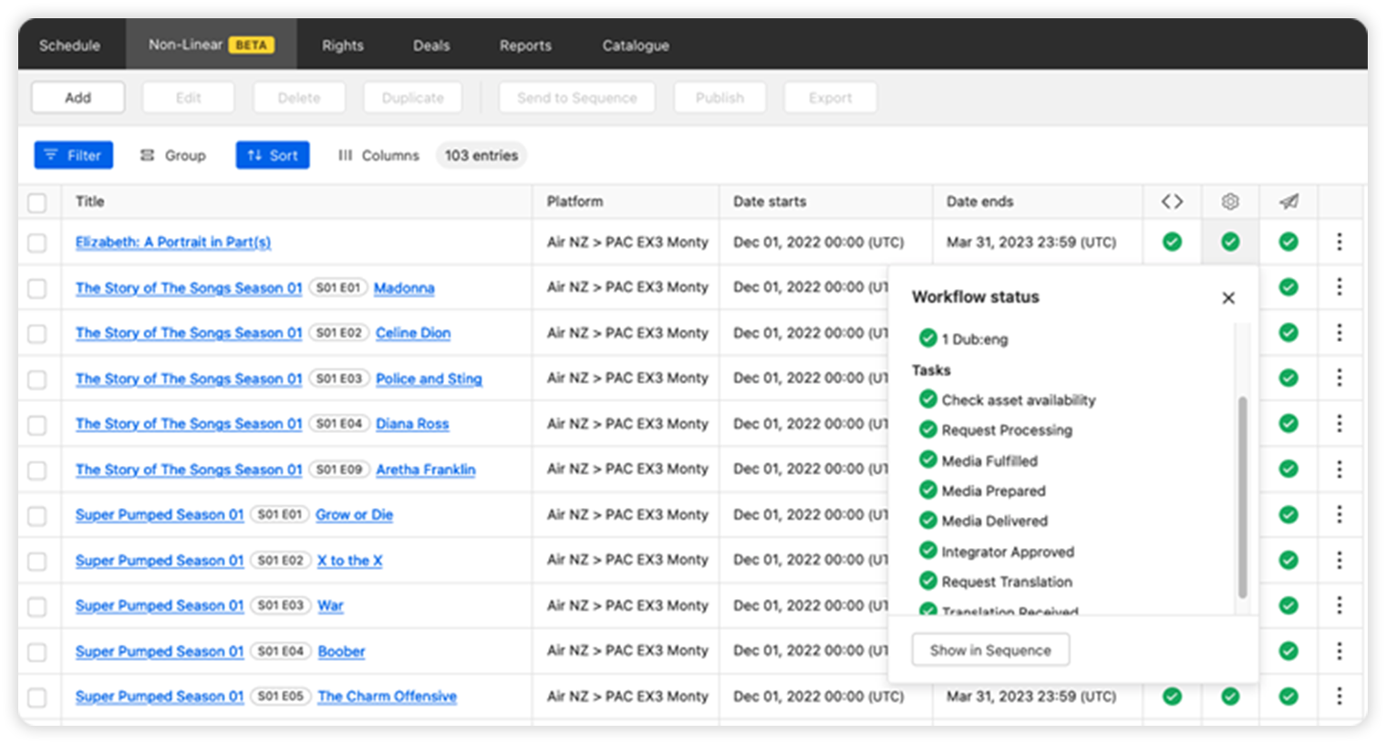 Example: asset and translation workflow tracked in Sequence and surfaced in the Non-Linear Schedule module