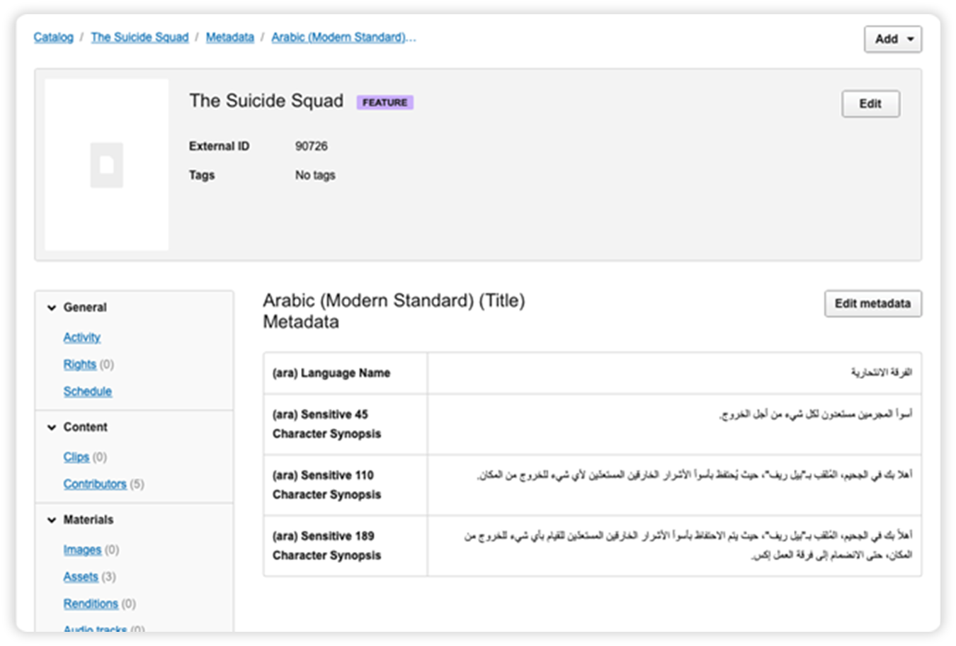 Example: Non-Latin character metadata translations housed in Mediagenix On-Demand, automatically populated to the API via an integration with language operations platform Unbabel